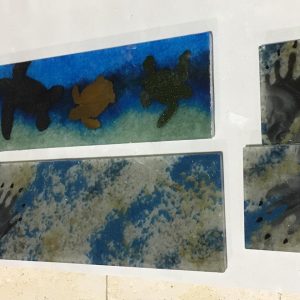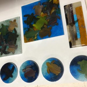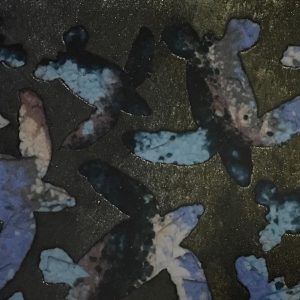Amazing Grace. True Grit. Happy Turtle Dance♥️🐢🐢🐢. Earth & Ocean Arts Festival. Cannon Beach, Oregon. September 20,21,22. Spiritual Reliquary snippets. Harlequins. Sargassum Seaweed. Beaver track. Leatherback Silhouette. First firing of trays, plates and coasters. Hawksbill color study.