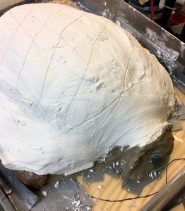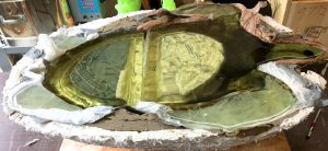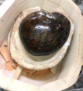 This is the part two slump of Mrs. Loggerhead’s carapace of many colors. The first slump was done in a custom made bisque mold. This second phase I molded a clay model of the carapace and set it in the glass plastron to help assure a proper fit. I formed the plaster mold from the clay model sitting in and on the glass plastron. The images are a small selection of that process. Many thanks to Team Member Carol Webb, owner of C3 studios, and her husband Paul’s assistance, for providing the studio and kiln space, so we could finish the carapace for Mrs. Loggerhead. In addition we finished the rest of the oil and healthy ocean sections for our Cycle of Life environmental art education sculpture.