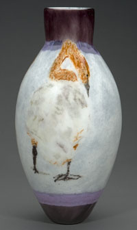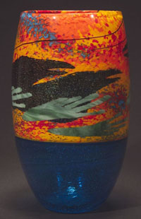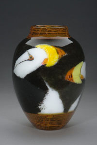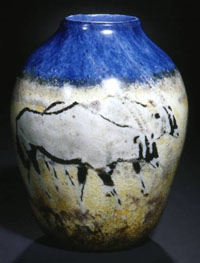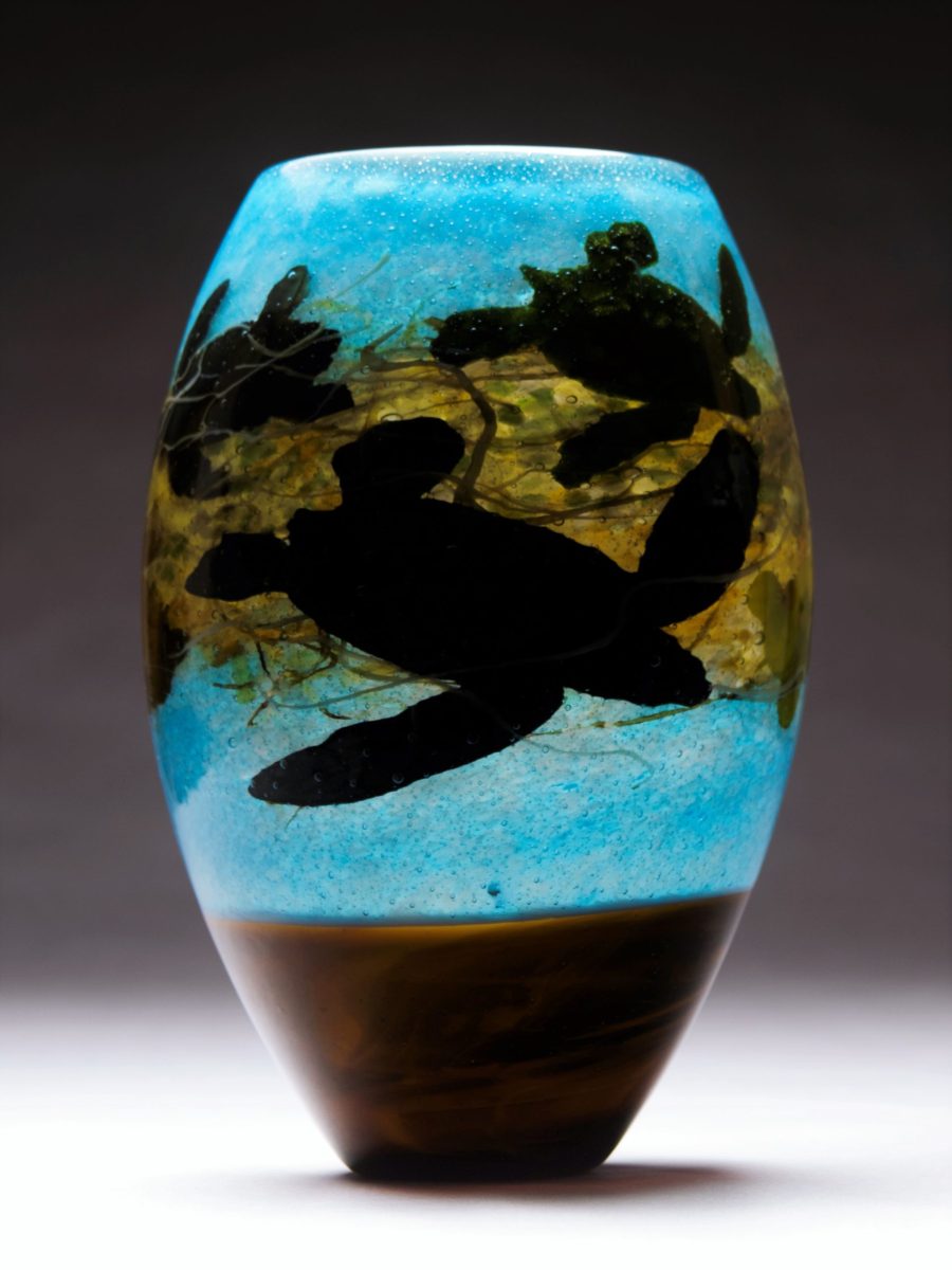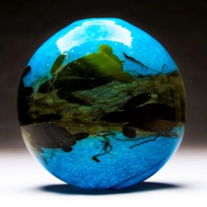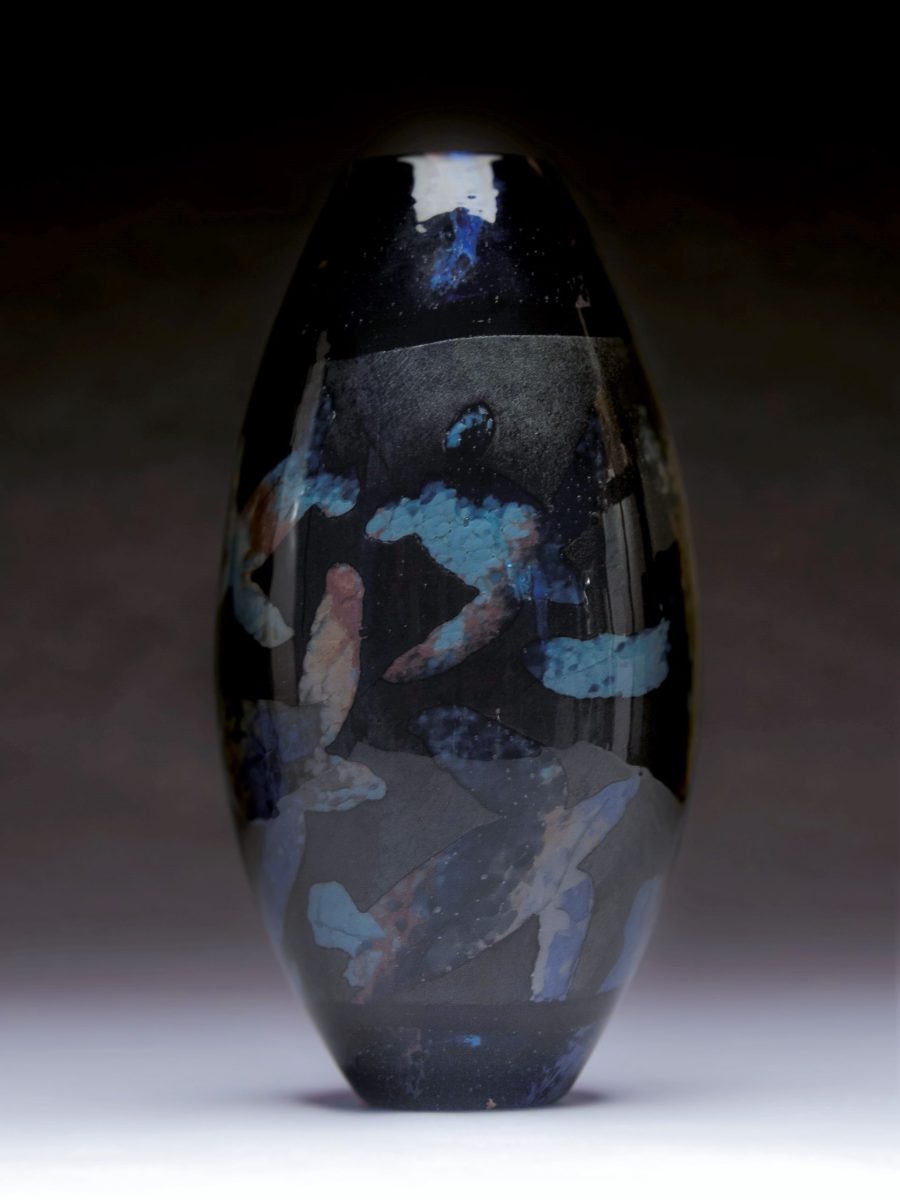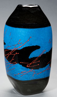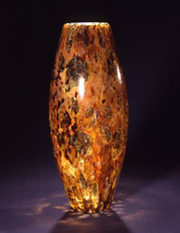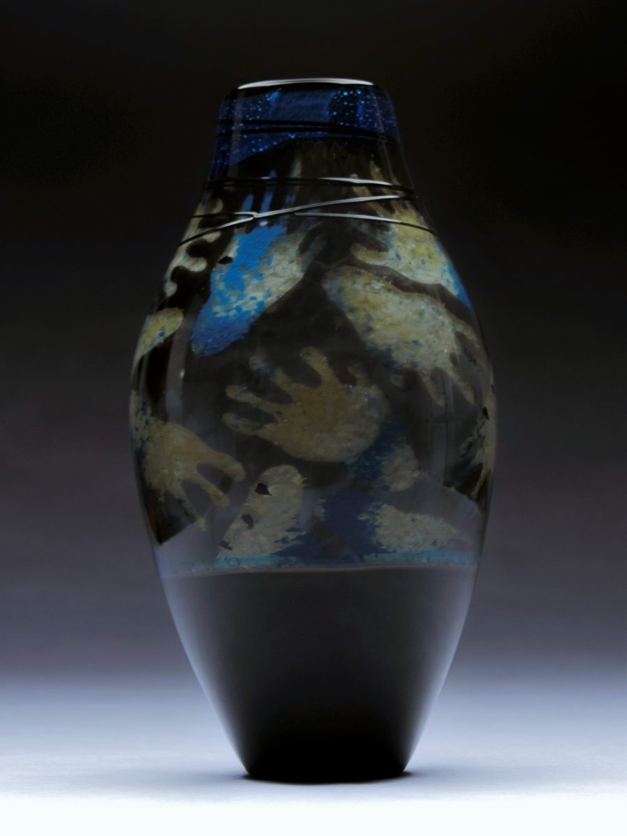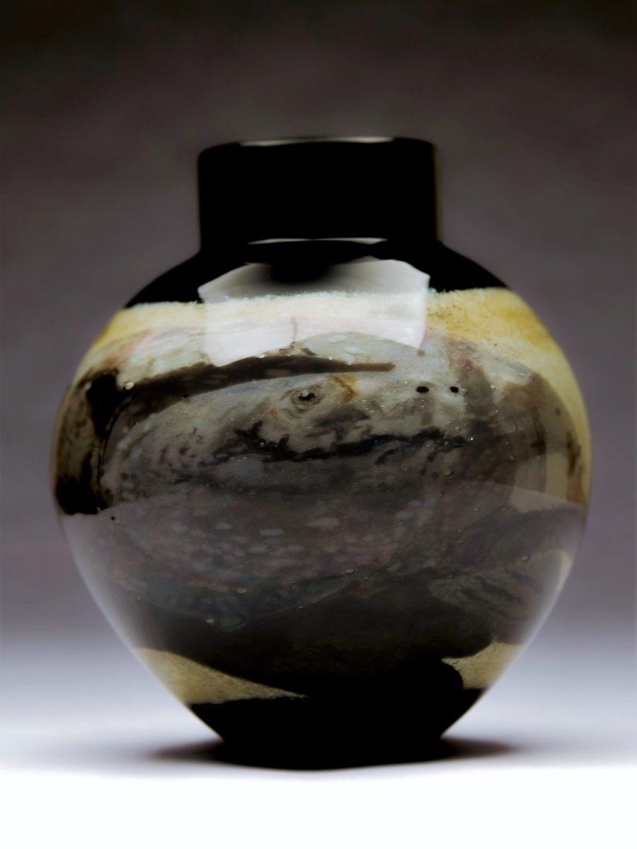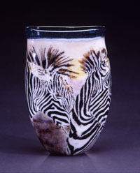 Spiritual reliquaries are glass vessels of living animal spirits. Kiln formed and hand blown glass techniques combine to create three dimensional vessels. The vessels are in two catagories. There are the FINE ART images of different wildlife as in my large fine art wall and disc pieces that are one of a kind. The GEO-VESSELS have different animal tracks abstractly crossing their surface and each one is slightly different and made individually but there are multiple vessels featuring the same track. These spiritual reliquaries feature kiln-formed glass by Kathleen Sheard and glass blowing by Lynn Read and Associates.