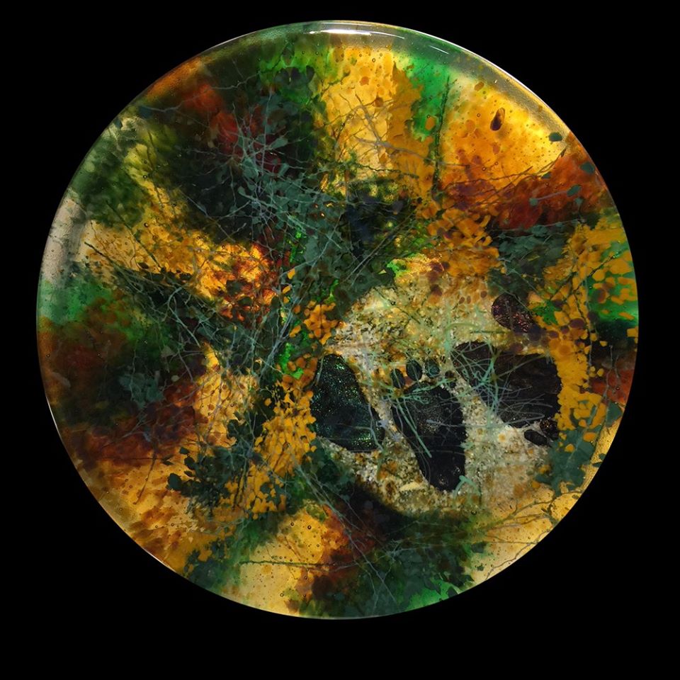 GeoTrack Disc – Black Bear Track. The GeoTrack Disc are approximately 17.5″ to 20″ in diameter and come with an acrylic stand, that can sit on a table or be put on a wall. Each one individually made and fired two to three times. Now a part of my show, Last Glance, at Montana Bliss Artworks (101 S 7th St, Hamilton, MT).