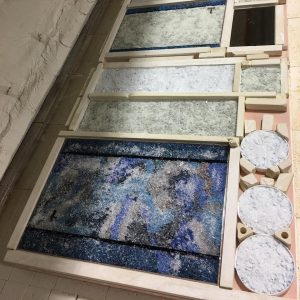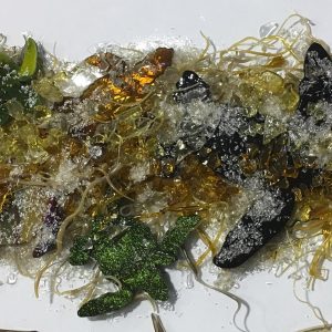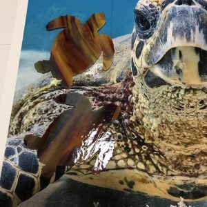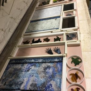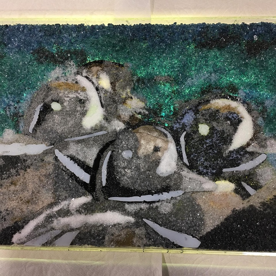Kiln running four vessel panels with in. 87 degrees studio. Harlequin Ducks. Sargassum Sea. Mamma Leatherback. Most grays Bullseye Frit palette incorporated. Turtle trays. Turtle Plates. Turtle Coasters. Beaver Track. (No image).